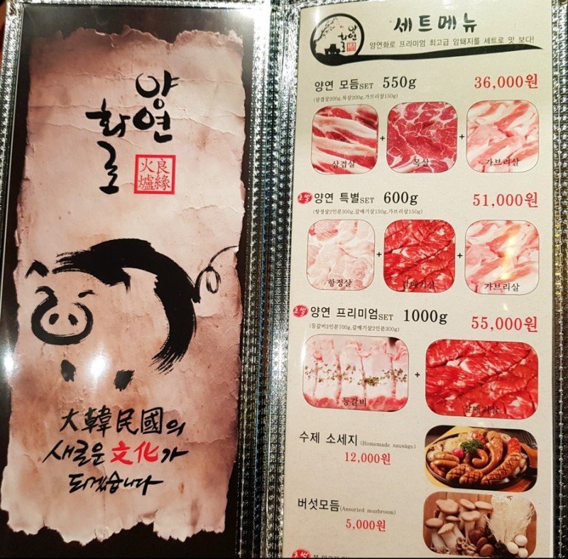 천안 맛집 베스트10 중 네번째로 추천드리는 맛집은 양연화로 입니다. 양연화로는 24시간 영업하고 주차장 있으므로 자차 이용해서 간다면 바로 앞에 주차하고 들어가면 됩니다. 먹자골목이 있는 쪽에 있으니 찾는 데 어려움은 없습니다. 룸과 테이블쪽으로 나뉘어있으니 편한 곳에 가서 식사하면 됩니다. 메뉴는 양연 모듬, 양연 특별, 양연 프리미엄 등입니다. 고기를 참숯에 먼저 초벌해서 나옵니다. 아무래도 고기류 음식은 굽는데 시간이 걸리므로 미리 초벌해둔 덕분에 2차 작업하는 데 그리 오래 걸리지 않습니다. 밑반찬도 고루고루 잘 나오고 무엇보다 새콤달콤한 파절이도 인기 만점입니다.